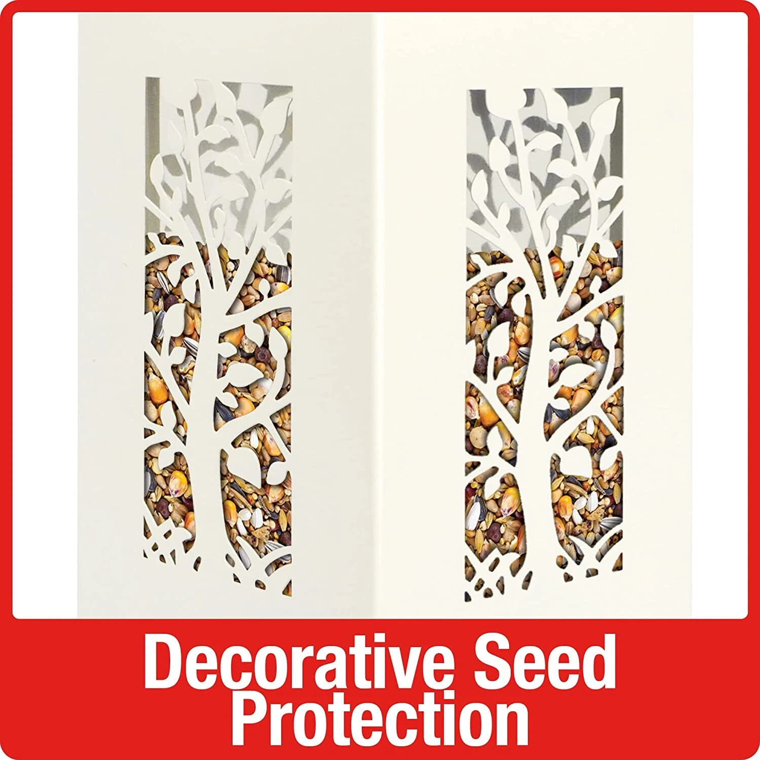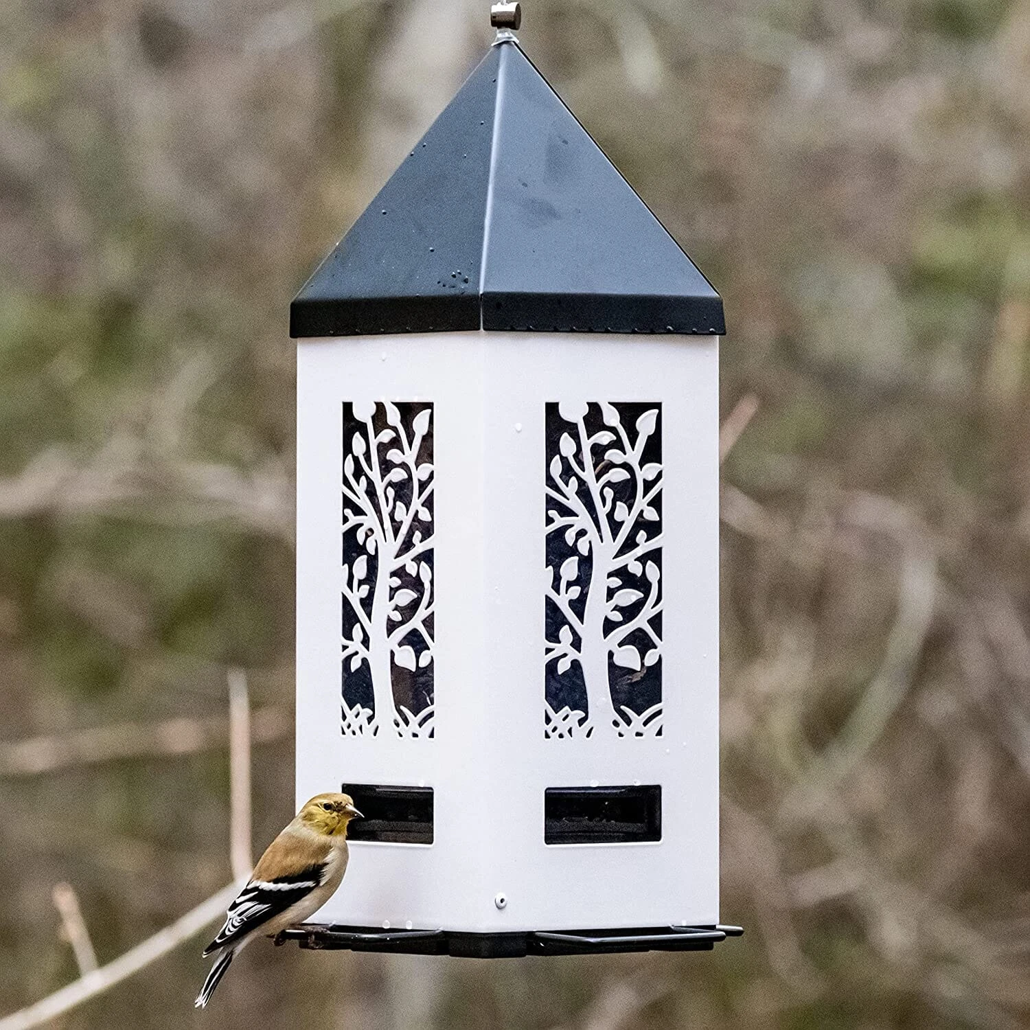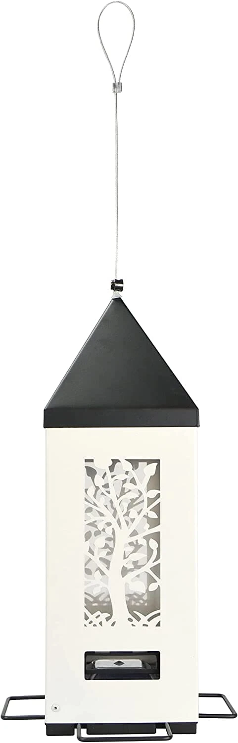 • Durable powder-coated metal locking roof external unit seed shield and perches