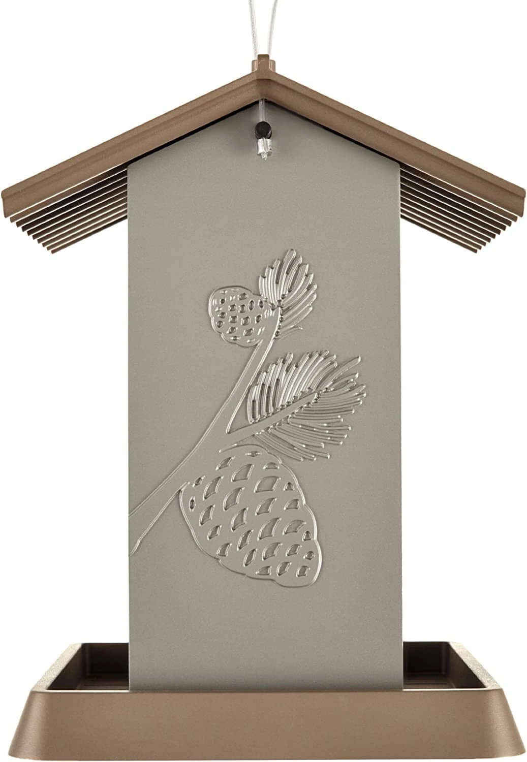 ⢠This birdfeeder displays a nature-inspired pinecone design on the side panels adding to the whimsical charm of the feeder