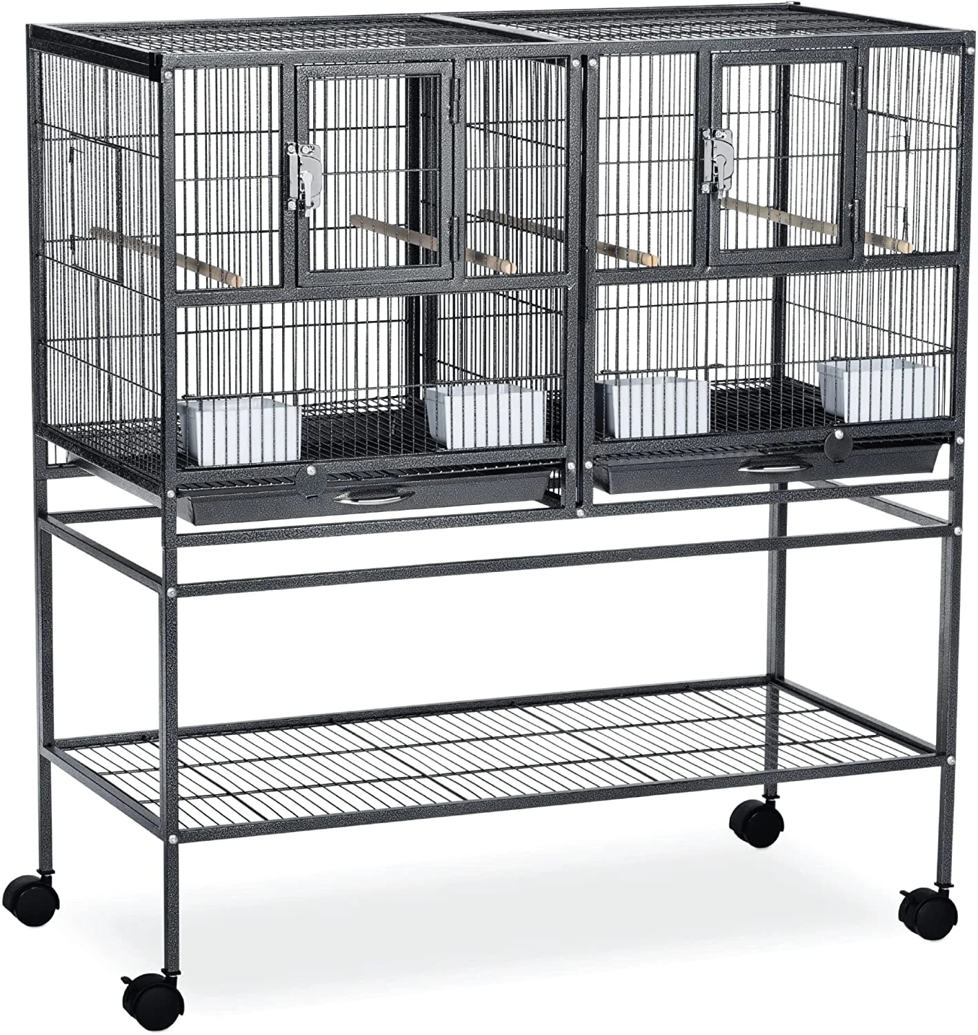 Prevue Hendryx’s Hampton Deluxe Divided Breeder with Stand is the ultimate breeding ground for your feathered friends. This amazing bird cage is made using wrought iron coated with a Hamertone finish for durability, and has 0.5″ wire spacing. The stand features an integrated storage shelf for all of your bird products, as well as rolling casters for easy transport. Use the included divider to create separate smaller bird cages or remove it to create one big living space. Each half of the bird cage features a front access door with a secure lock, side nesting doors, and pull out trays and grilles complete with wind bell locks. As an added bonus, the product is spacious enough for use as an independent unit, and can be made multi-level (up to three levels) by stacking the Hampton Deluxe Divided Breeder on top. The Hampton Deluxe Divided Breeder with Stand comes with four perches and four plastic cups.
