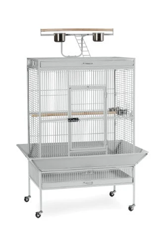 The Prevue Hendryx Select Bird Cage – Pewter White – 35.375″ x 23.5″ x 67″ is a high quality wrought iron bird cage offers a unique, modern design for medium and large sized birds. This cage has a large hinged front access door with double locks to provide additional security for clever and mischievous feathered friends. As many birds tend to be a bit messy in their enclosures, the Prevue Hendryx Select Bird Cage features rounded corner seed guards to control debris spill during feeding and a pull-out bottom grille with debris trays for easy and hassle free cleaning. Despite having a spacious interior, there is a separate play area with ladders and a wood bar on top of the cage for more freedom during playtime. The unit comes on wheels for added mobility.