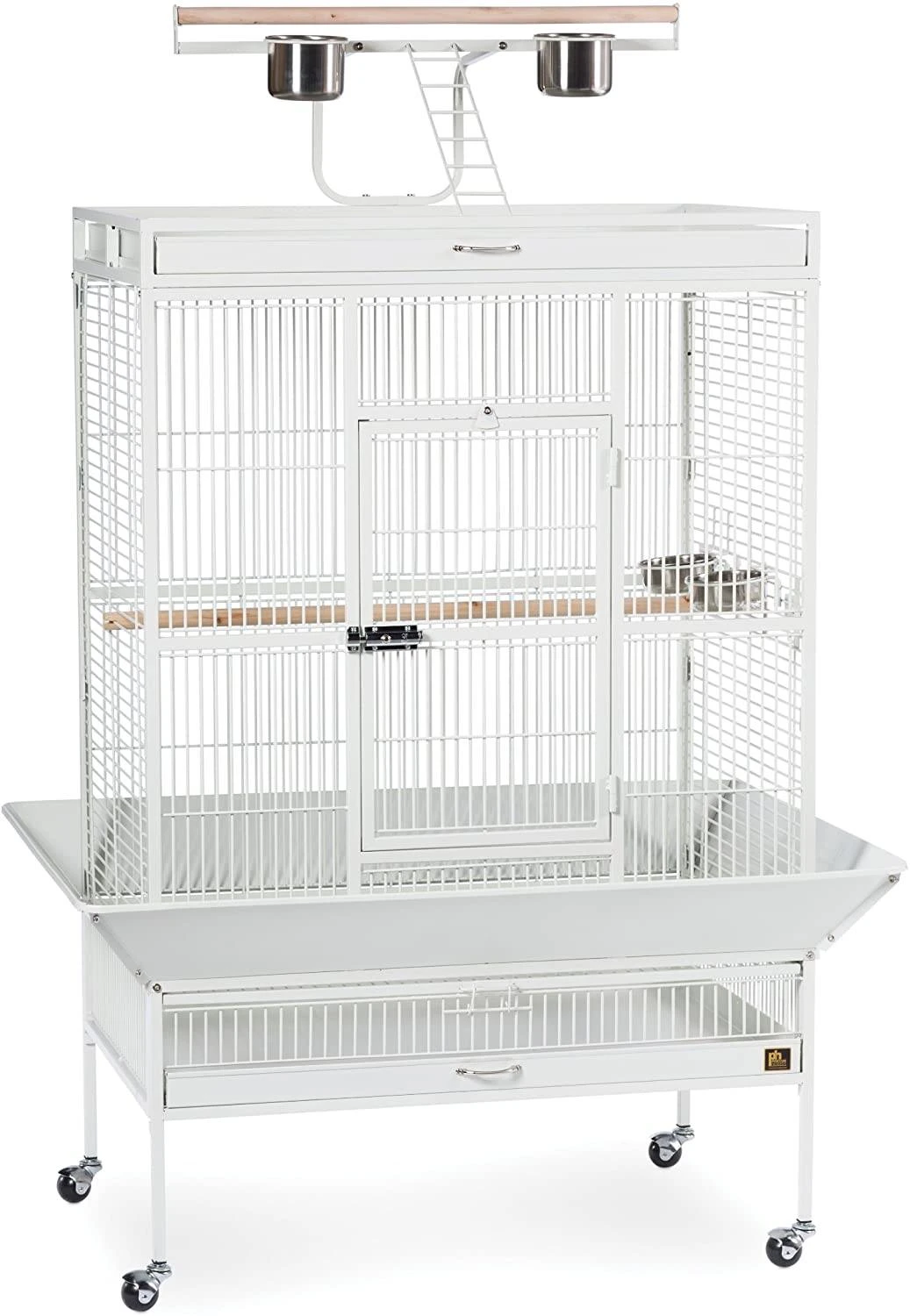 Prevue Hendryx’s Black Wrought Iron Select Bird Cage with Playtop is the ultimate home for your parrot or similar sized bird. This amazing, rectangular cage is constructed of wrought iron for durability, and features a cagetop playstand to keep your bird entertained and content. In addition, the product has large hinged front access doors with double locks to keep your bird secure. The Wrought Iron Select Bird Cage sits on a castered stand for portability, has 0.75″ wire spacing, and comes with four stainless cups and two wooden perches. As an added bonus, the cage has a pull-out bottom grille and debris tray for easy cleaning, as well as a seed guard with rounded corners to control debris mess.